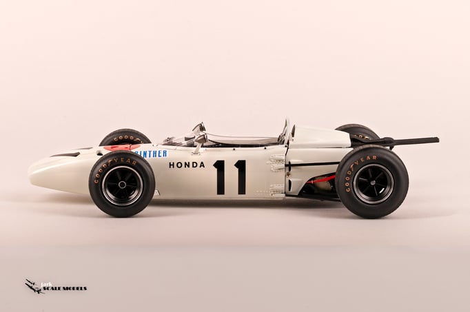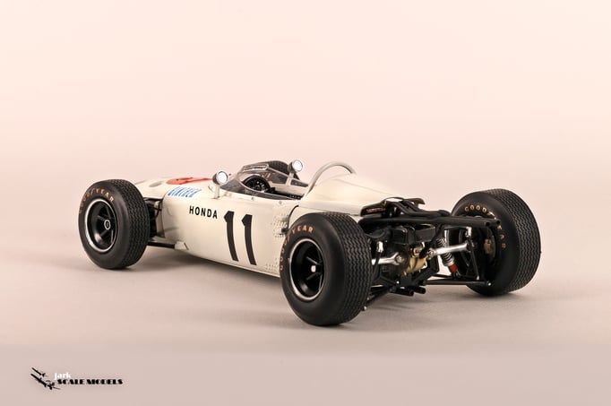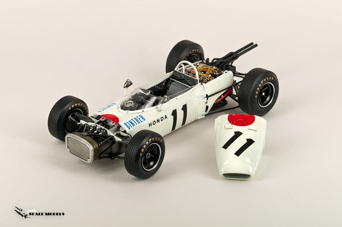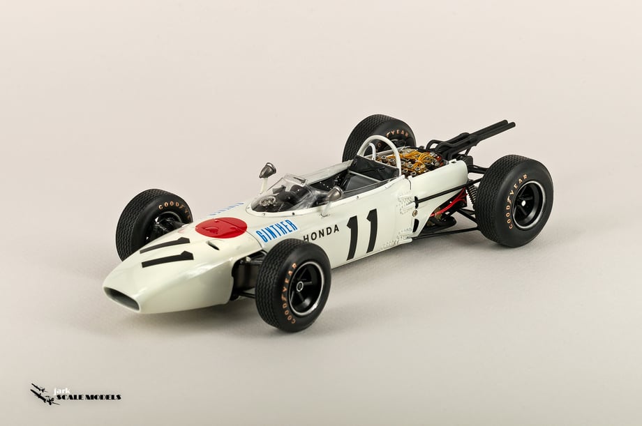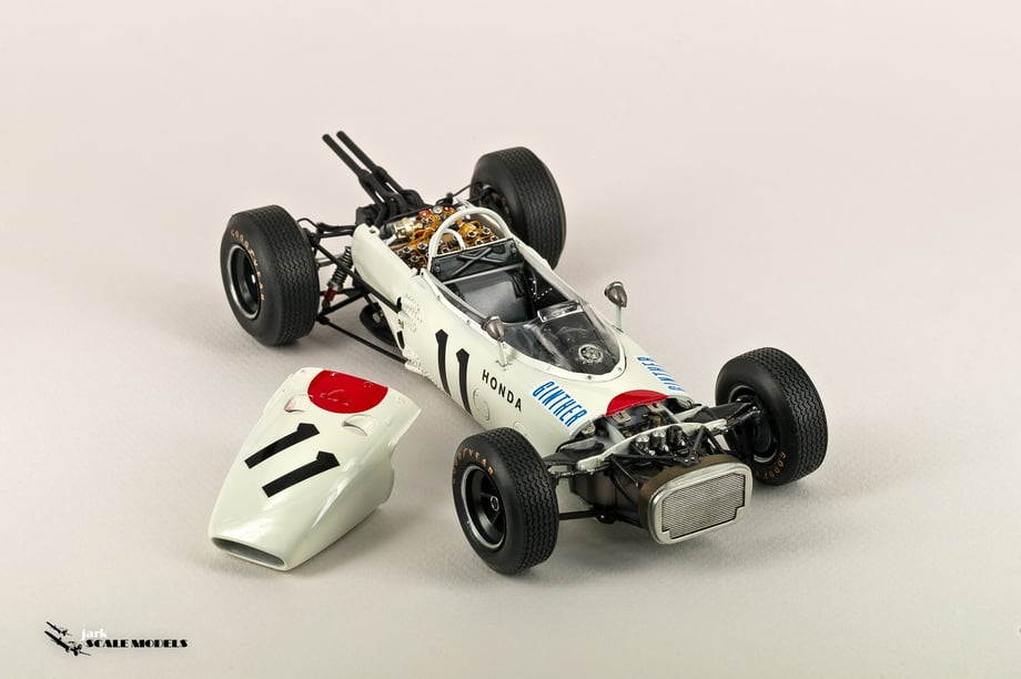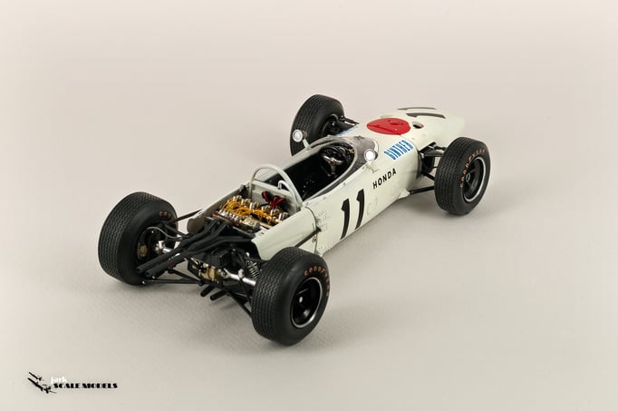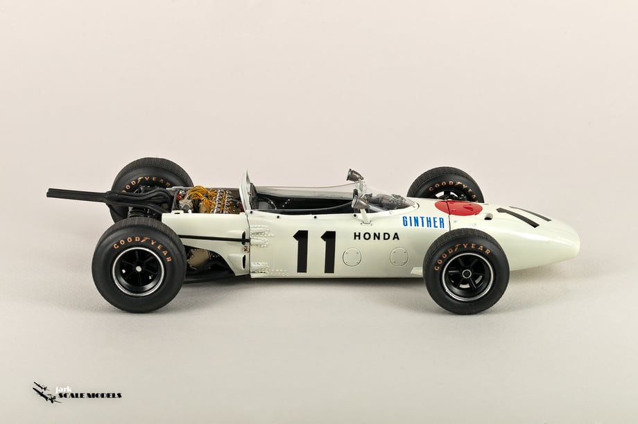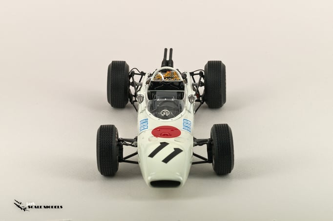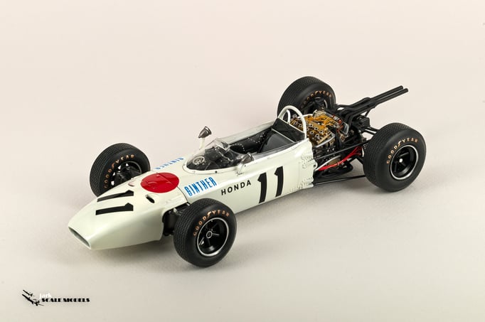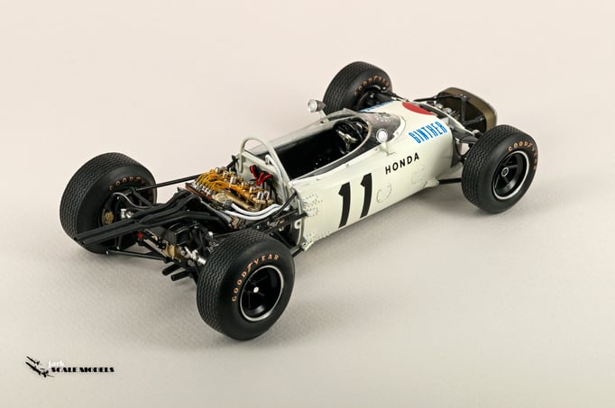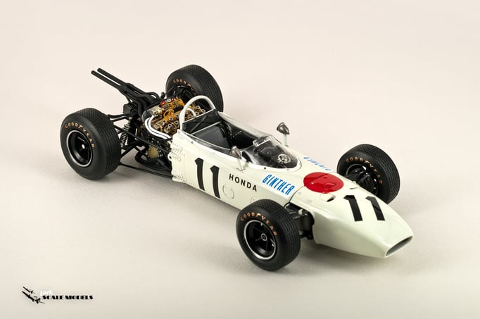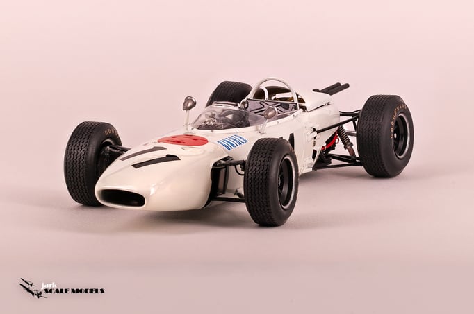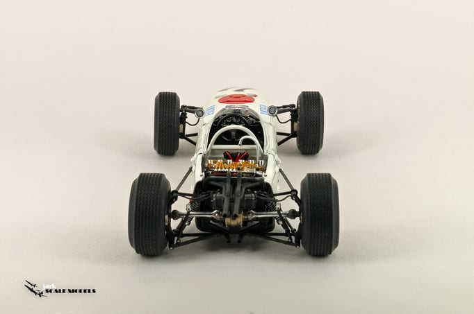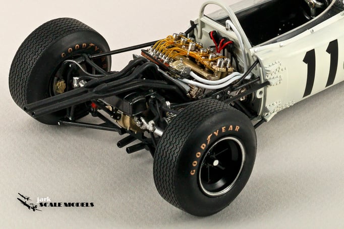 So I decided to start with something relatively "simple". To me, the sixties racing has the most beautiful cars of all eras so I pick up this Tamiya kit of the winner of the Mexican Grand Prix of 1965. The kit is quite old and it shows its age but is a strong base to add extra detail. I've added all hoses and connectors in the engines as well as some extra scratch detail at the nose area, wheels and windscreen.