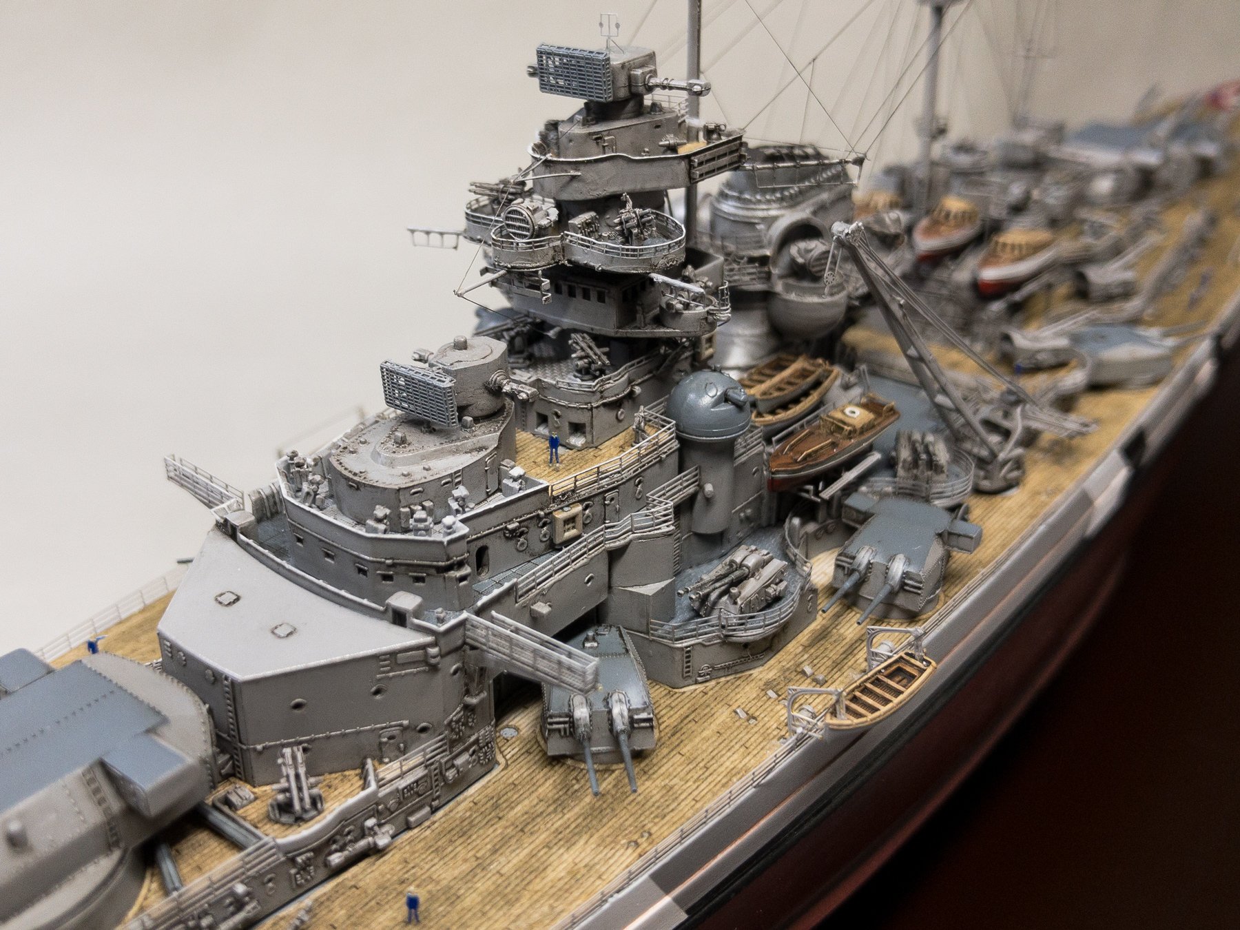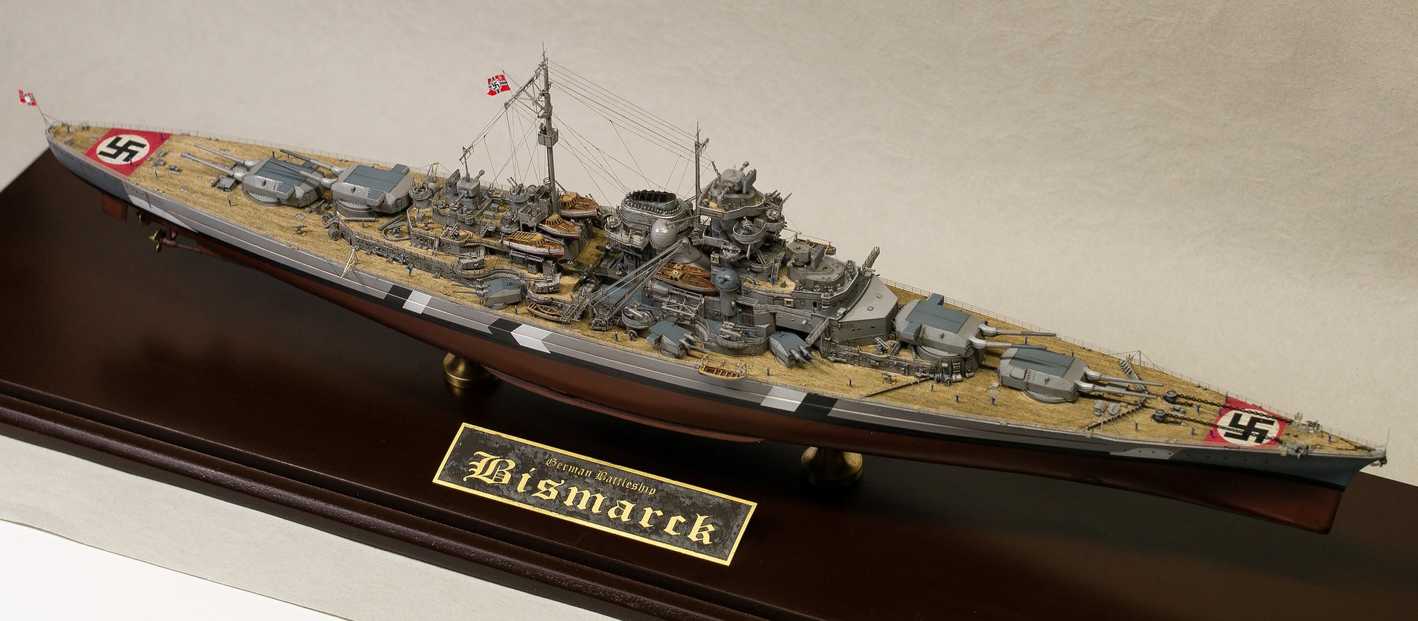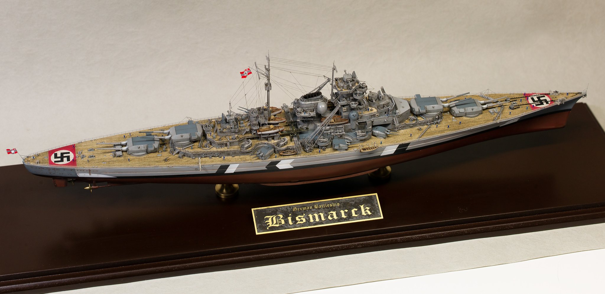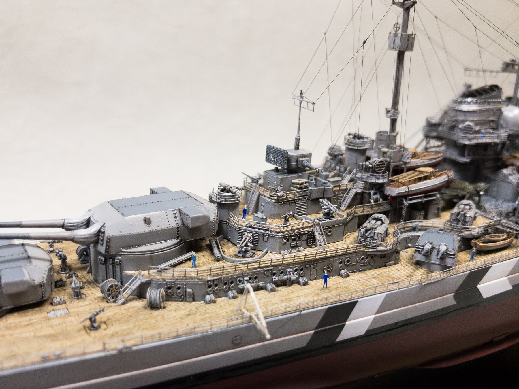 I chose to build it as seen on the 21 of May of 1941 when at the beginning of operation Rheinübung, Bismarck and Prinz Eugen stopped briefly in Grimstadfjord, southwest of Bergen in Norway. The baltic camouflage on the superstructure was no longer there but it is still visible on the hull with the sailor starting to paint it over.