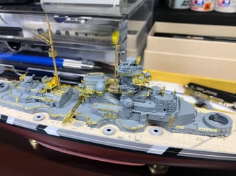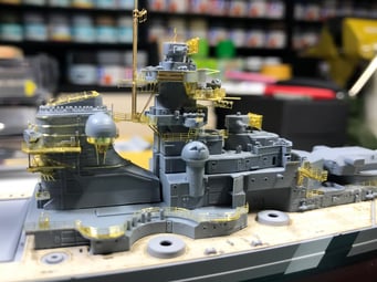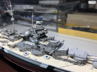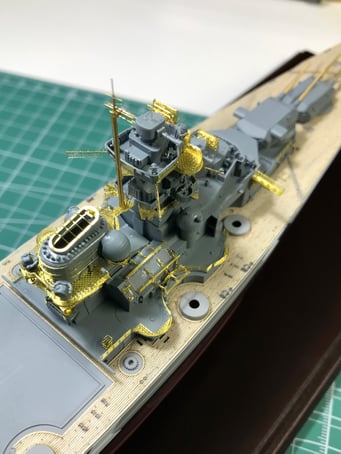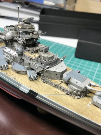 Since I got into model making I always wanted to build the Bismarck. 13 years ago I purchased Revell's 1/350 scale kit, back then the best and most complete kit you could it have. Unfortunately soon after I moved across the world and I couldn't bring it with me. Then years later I got Trumpeter's 1/700 with a bunch of aftermarket detailed sets but then again, after my daughter was born I was not able to build it because of lack of time and I put it aside with the hull and turrets done. But this year when browsing online at my local hobby shop I stumbled upon this AMAZING Flyhawk kit. I got the deluxe FH1132S version which comes with 8 plates of photo etched parts and metal barrels. Because this was my third attempt to build it and motivated to do the best possible I've also got a wooden deck and detailed metal mast by infini models. And finally, exactly after a month of working every day I've finished.